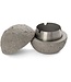 Mondförmiger Aschenbecher mit Deckel, aus Beton und Edelstahl. Unvollkommenheiten sind Teil des Produkts und ahmen die Krater des Mondes nach.