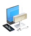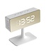 Futuristic digital alarm clock with a rectangular silver-colored mirrored LED display and a curved matte white base. This unusual alarm clock has a 12 or 24 hour display, a digital beep alarm, snooze function, night mode and brightness setting, and optional temperature display.