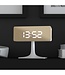 Futuristic digital alarm clock with a rectangular silver-colored mirrored LED display and a curved m..