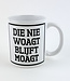 Mug for coffee, tea or other hot drinks with print in Ghent dialect: “Die Nie Woagt Blijft Moagt” (nothing ventured, nothing gained).