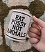 Mug for coffee, tea or other hot drinks with print 'Eat Pussy Not Animals'.