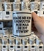Mug for coffee, tea or other hot drinks. With print in local dialect: 'Goade ne kier 5 minuuten mee maa de zot ouwen?'.