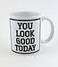 Mug for coffee, tea or other hot drinks with print 'You Look Good Today'.