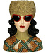 The lady wears a stylish fur hat and perfectly matching jumper. Her look is completed by a pair of trendy sunglasses.