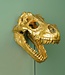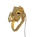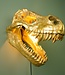 Lampe d'ambiance décorative pour le mur en forme de dinosaure doré : Rexy. Rexy met la lampe dans sa bouche ouverte. Une combinaison de sculpture et de lampe en un (ampoule non incluse).