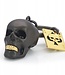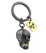 Porte-clés en métal en forme de crâne noir avec des dents en or.