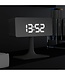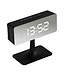 Réveil numérique futuriste avec un écran LED rectangulaire en miroir argenté et une base incurvée noire mate. Ce réveil inhabituel dispose d'un affichage 12 ou 24 heures, d'une alarme sonore numérique, d'une fonction snooze, d'un mode nuit et d'un réglage de la luminosité, ainsi que d'un affichage de la température en option.