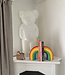 Een keramische boekensteun in de vorm van een regenboog, met een hobbelige, kleurrijke textuur die je huis vrolijk zal maken!