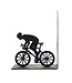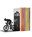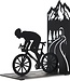 Mooie zwarte boekensteun met daarop het silhouet van een wielrenner in een berglandschap. De onderkant van de boekensteun is voorzien van siliconen nopjes zodat de steun niet snel wegglijdt.