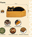 Een deurmat in de vorm van een kat die wegduikt in een kartonnen doos.