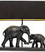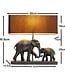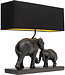Deze bijzondere tafellamp straalt rustieke elegantie en exotische flair uit. Twee gedetailleerd vervaardigde olifanten ondersteunen de volledig zwarte lamp, terwijl de gouden binnenkant van de linnen kap zorgt voor een warme, sfeervolle verlichting.