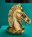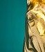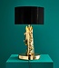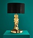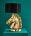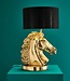 Indrukwekkende tafellamp, bestaande uit een krachtig gouden paardenkop met daarboven een gitzwarte lampenkap. De lamp is gemaakt van hoogwaardig aluminium, wat samen met het elegante paardenmotief zorgt voor een luxueuze uitstraling.
