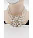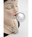 De zilveren bubbel en parelsieraden springen in het oog, geaccentueerd door het zwarte haar en de zwarte kleding.