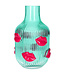 Sexy vaas in transparant turquoise glas en versierd met rode lippen. Ervan genieten kan zowel mét als zonder bloemen.