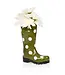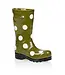 Vaas in de vorm van een regenlaars, in het groen met witte stippen.