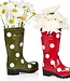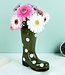 Vaas in de vorm van een regenlaars, in het groen met witte stippen. Lees meer..
